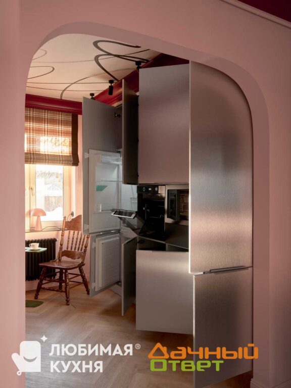 Стену напротив займут высокие пеналы. Их корпуса – из ДСП с ламинацией «Серебро чукотское дымчатое». Один из пеналов дополняем стеклянными распашными дверцами в алюминиевых рамках. Остальные фасады тут – металлизированные, из коллекции Scalar. Декор – Satin Silver. Все панели для мебели сделаны в Санкт-Петербурге.