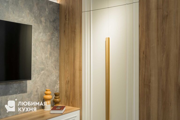 Брутальный санузел, для любителей темных оттенков. Тумба с темной столешницей в сочетании с графитовым серым и теплым деревом создает ощущение камерного и глубокого пространства. Вместительные встроенные шкафы позволяют разместить все необходимое, не создавая визуальный шум.
