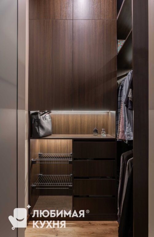 Надежная раковина с тумбой выполнена в минималистичном стиле с гладкой белой поверхностью. Рифленый фасад тумбы добавляет текстуру и интересный визуальный акцент. На стене расположены встроенные шкафы в темных тонах, что создает эффект глубины и стиля. Высота шкафов обеспечивают достаточно места для хранения туалетных принадлежностей, сохраняя пространство чистым и организованным.