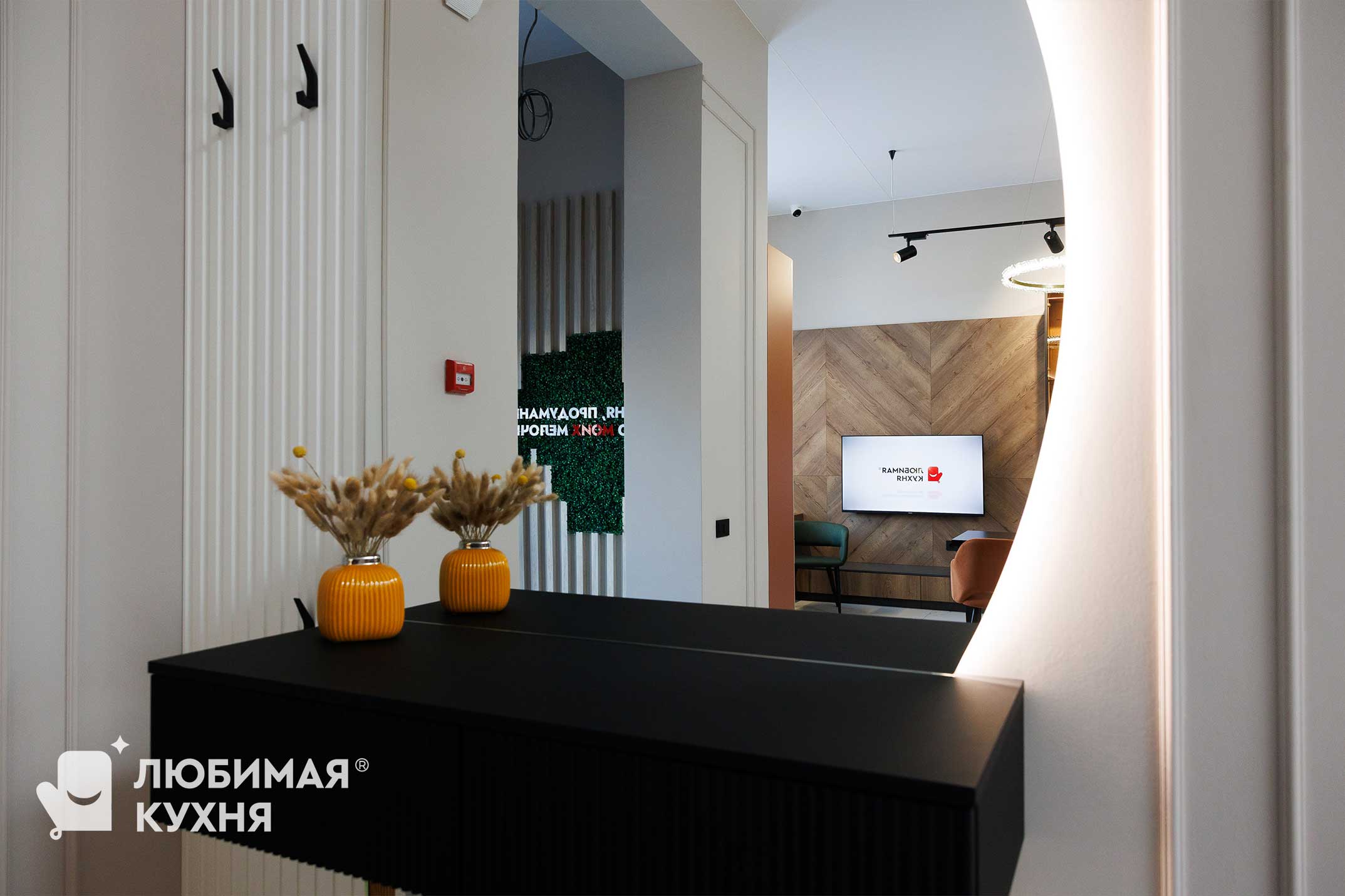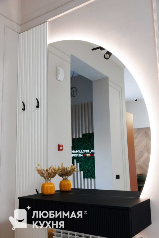 Стильная зона для прихожей в современном минималистичном дизайне. Подвесная консоль чёрного цвета с рифленым фасадом эффектно контрастирует со светлыми стенами и создаёт лёгкое ощущение парения. Рифленая стеновая панель и круглое зеркало с мягкой подсветкой по периметру визуально расширяет пространство и добавляет уюта, создавая функциональную и эстетичную входную зону.