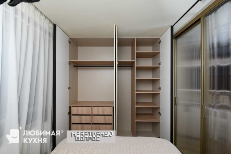 Шкаф скомплектован тремя дверями-купе. За каждой дверцей удобно расположены полки и штанги. Шкаф оснащен всем необходимым: пантографом для одежды на плечиках, выдвижными ящиками и корзинами для мелких вещей, брючницей, галстучницей, есть отделение для хранения гладильной доски.