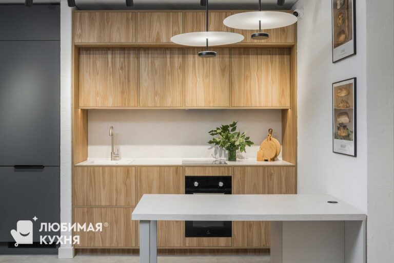 Это отличный выбор для квартир с высокими и стандартными потолками, особенно если кухня небольшая. Также такой формат подходит для студий, где важно сохранить визуальную аккуратность и закрыть всю стену функциональной мебелью.