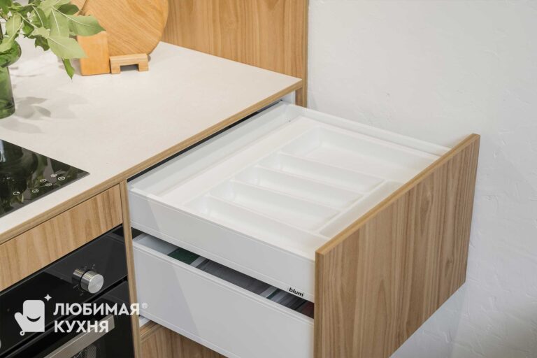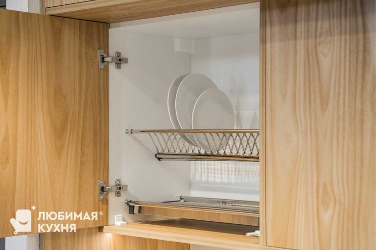 Главное преимущество — дополнительное место для хранения. Верхние секции можно использовать для редко используемой посуды, заготовок или бытовой техники. Кроме того, гарнитур до потолка создаёт ощущение целостности и визуально «вытягивает» помещение вверх.